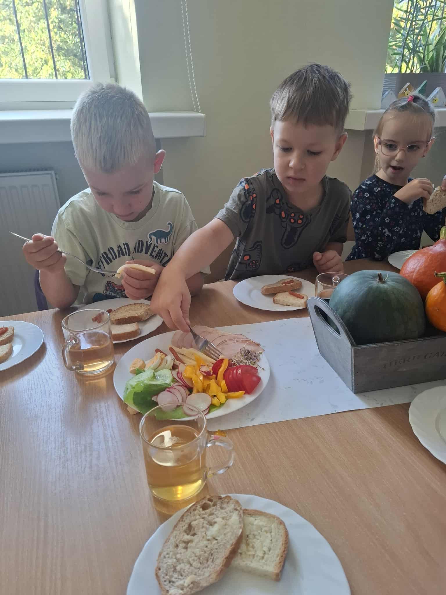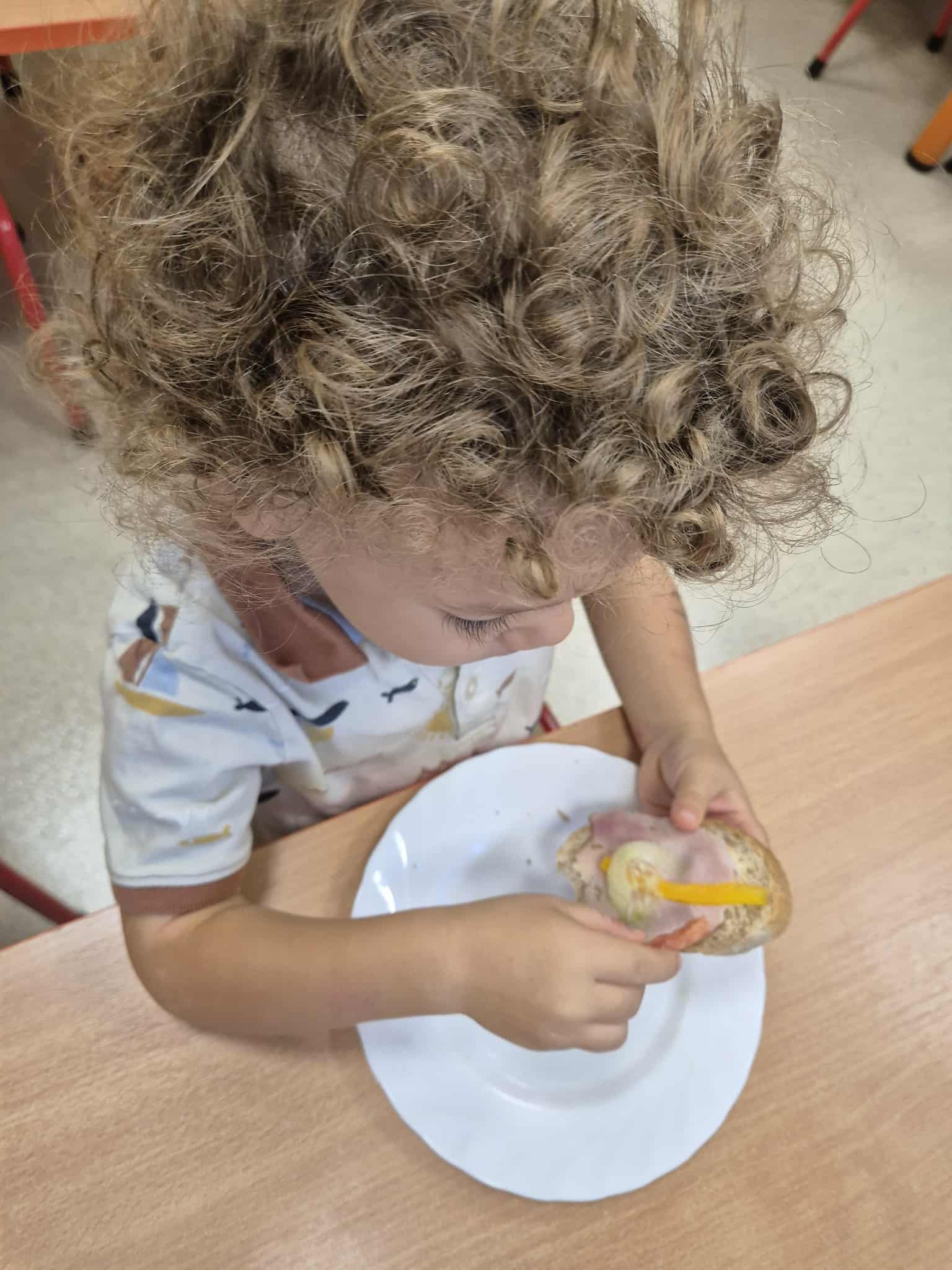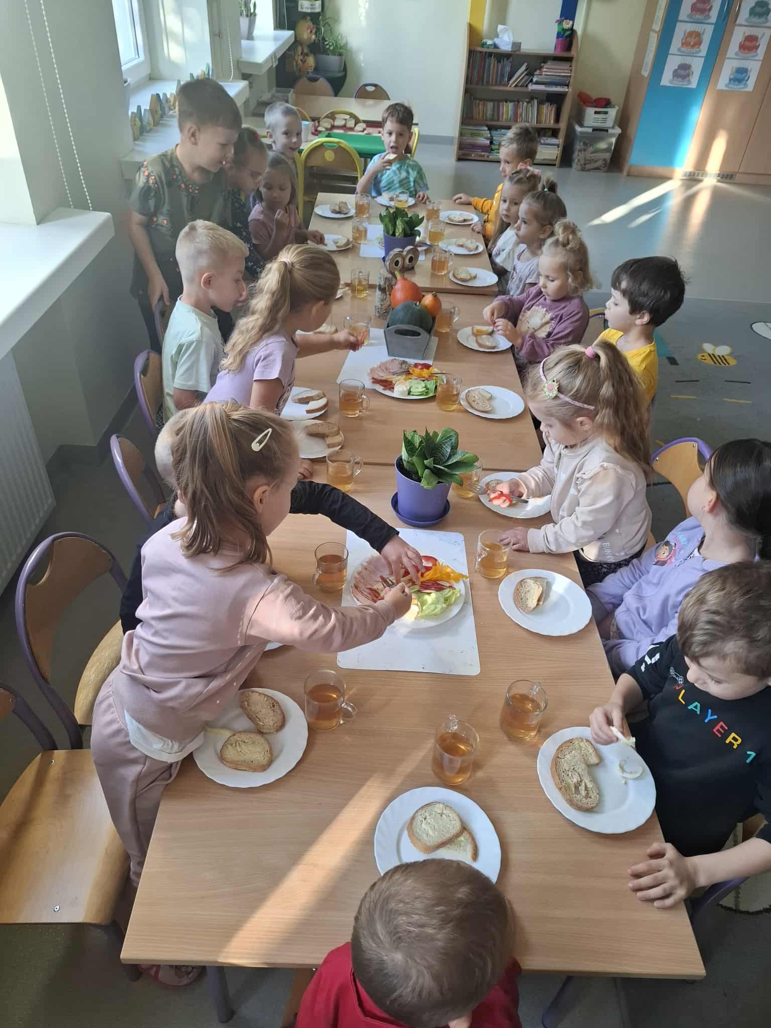Przedszkolaki samodzielnie przygotowują swoje kanapki, ucząc się przy tym zdrowych nawyków żywieniowych, samodzielności i radości ze wspólnego posiłku.