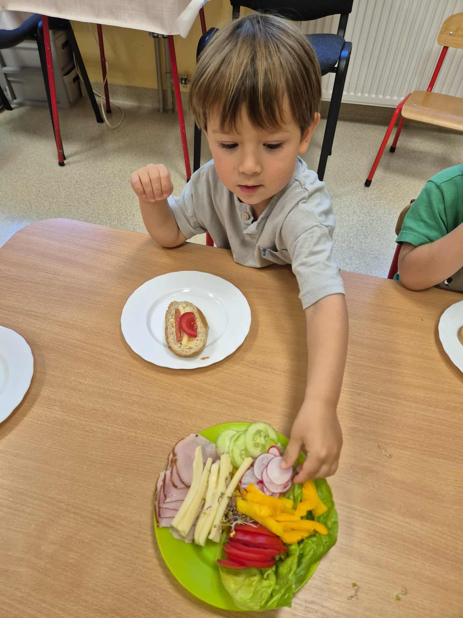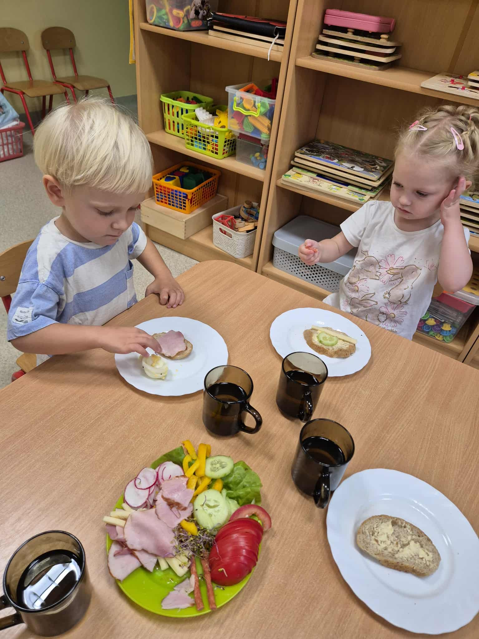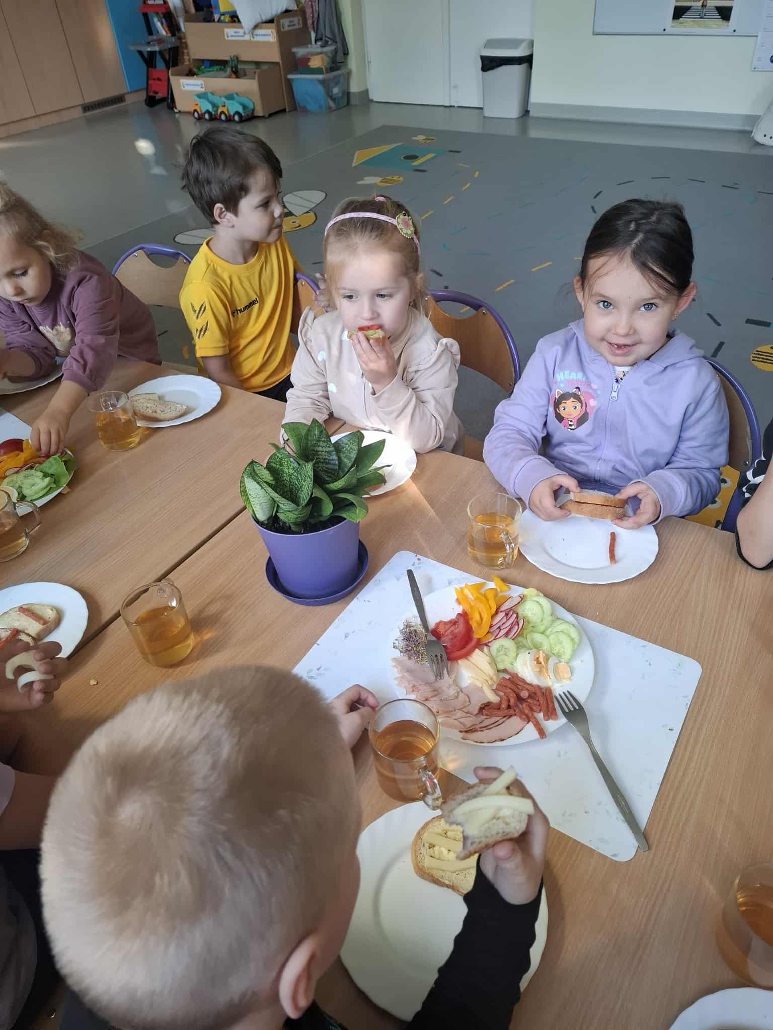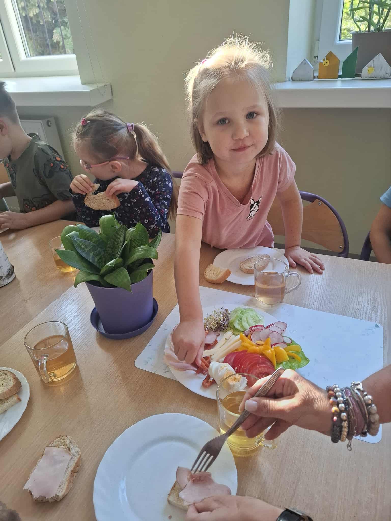 Przedszkolaki samodzielnie przygotowują swoje kanapki, ucząc się przy tym zdrowych nawyków żywieniowych, samodzielności i radości ze wspólnego posiłku.