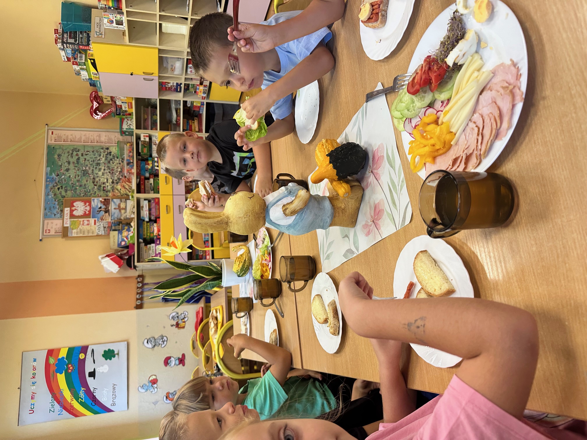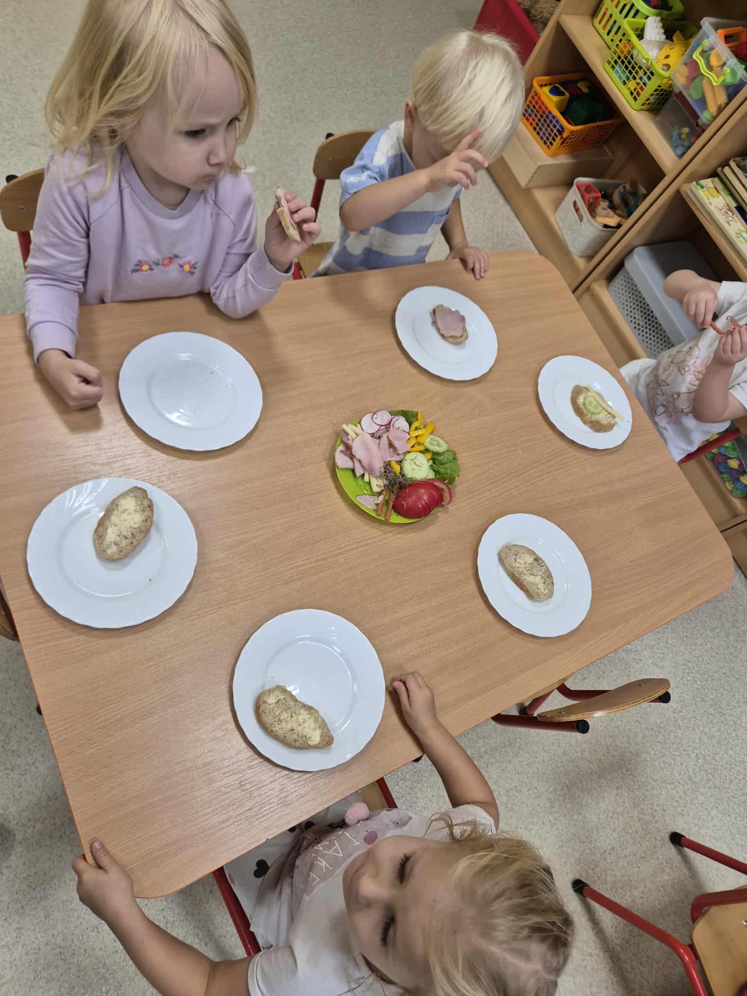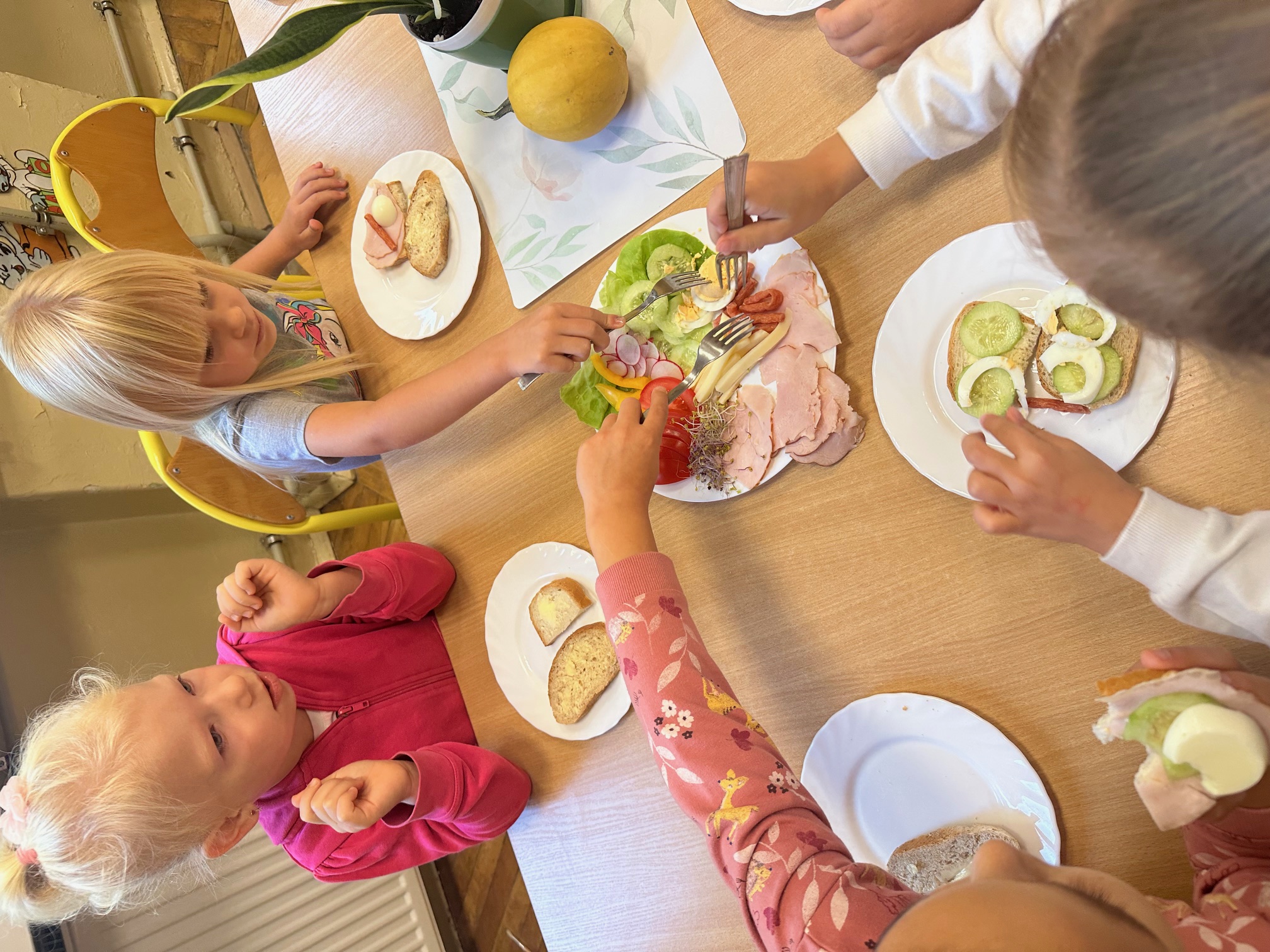 W naszym przedszkolu regularnie odbywają się śniadania w formie szwedzkiego stołu. Na stole czekają świeże, zdrowe produkty – pieczywo, warzywa, sery i wędliny.