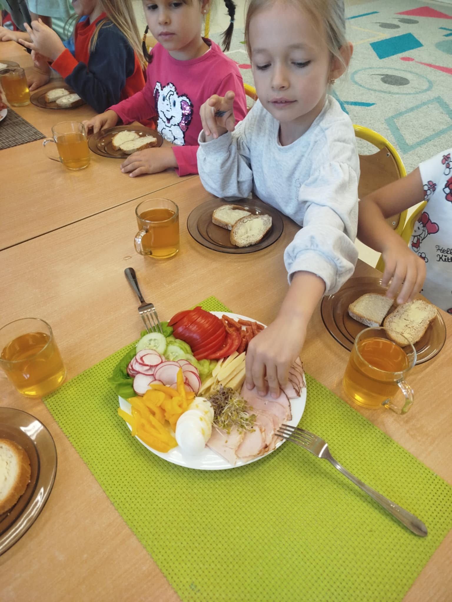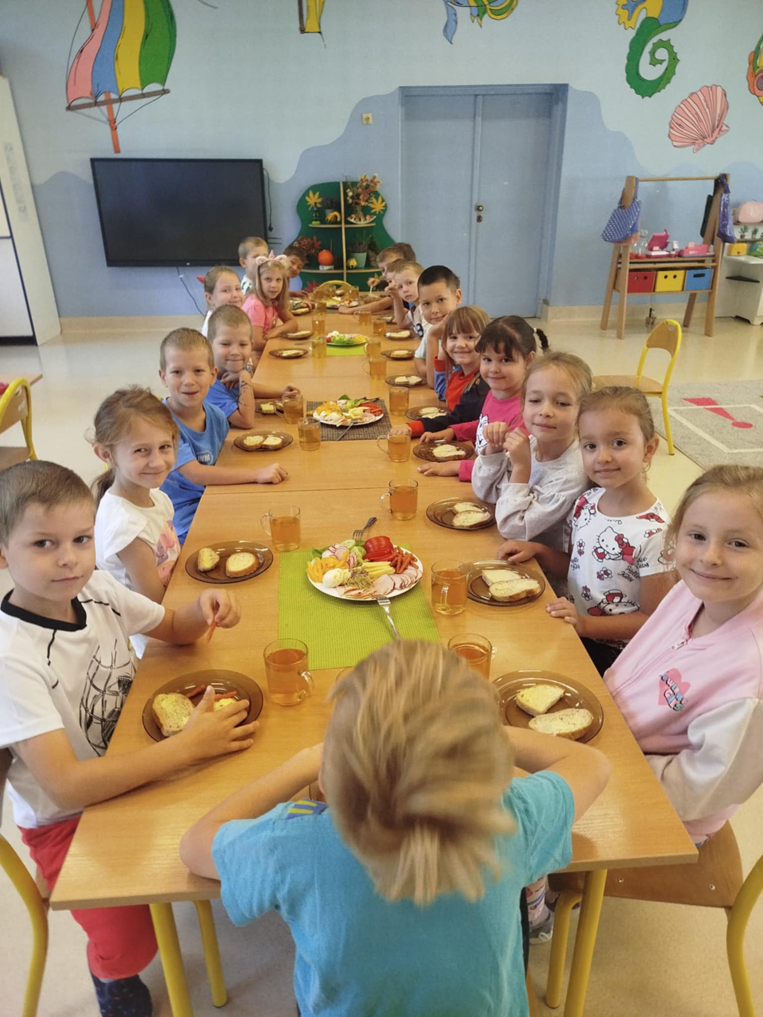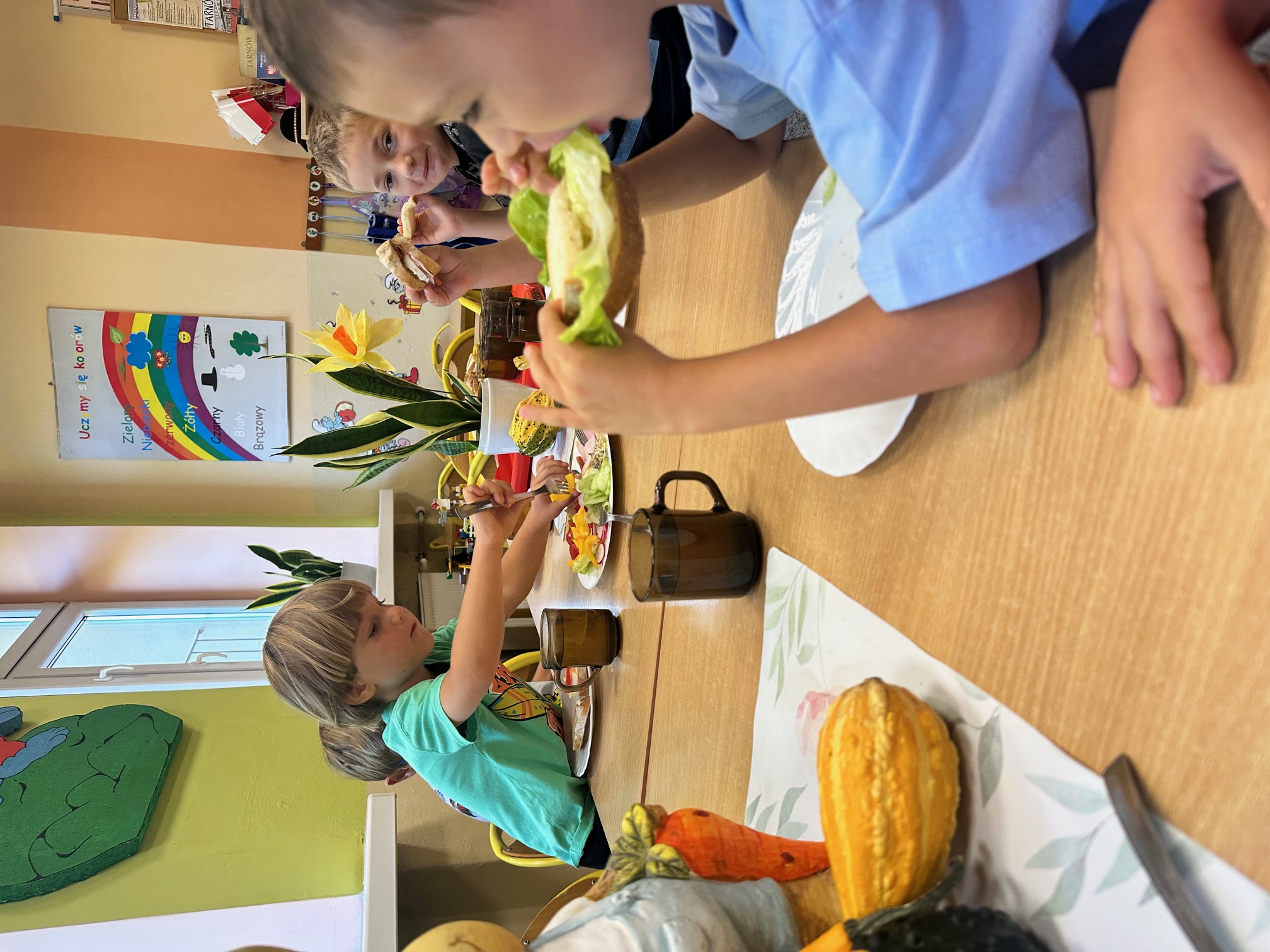 W naszym przedszkolu regularnie odbywają się śniadania w formie szwedzkiego stołu. Na stole czekają świeże, zdrowe produkty – pieczywo, warzywa, sery i wędliny.