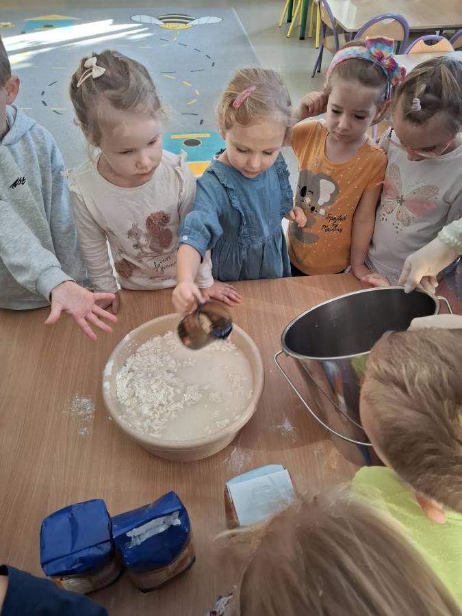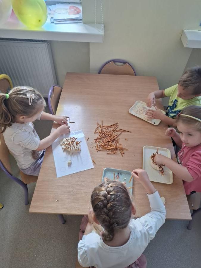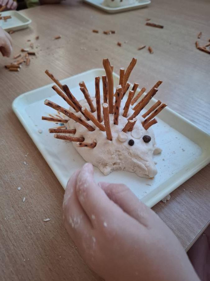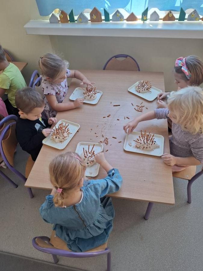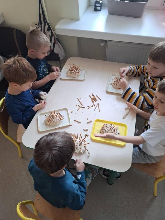 Na dzisiejszych zajęciach wspólnie wykonaliśmy masę solną. Starannie odmierzaliśmy wszystkie składniki i dokładnie mieszaliśmy masę. Kolce wykonaliśmy z paluszków, a ziele angielskie pomogło nam w wykonaniu oczek dla Jeżyków . Była to niezwykła zabawa.
