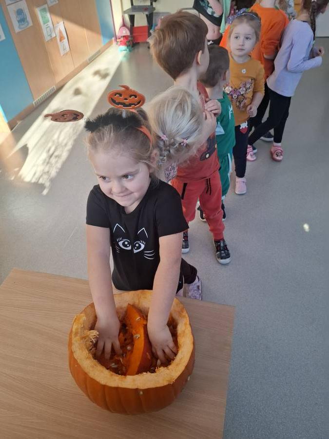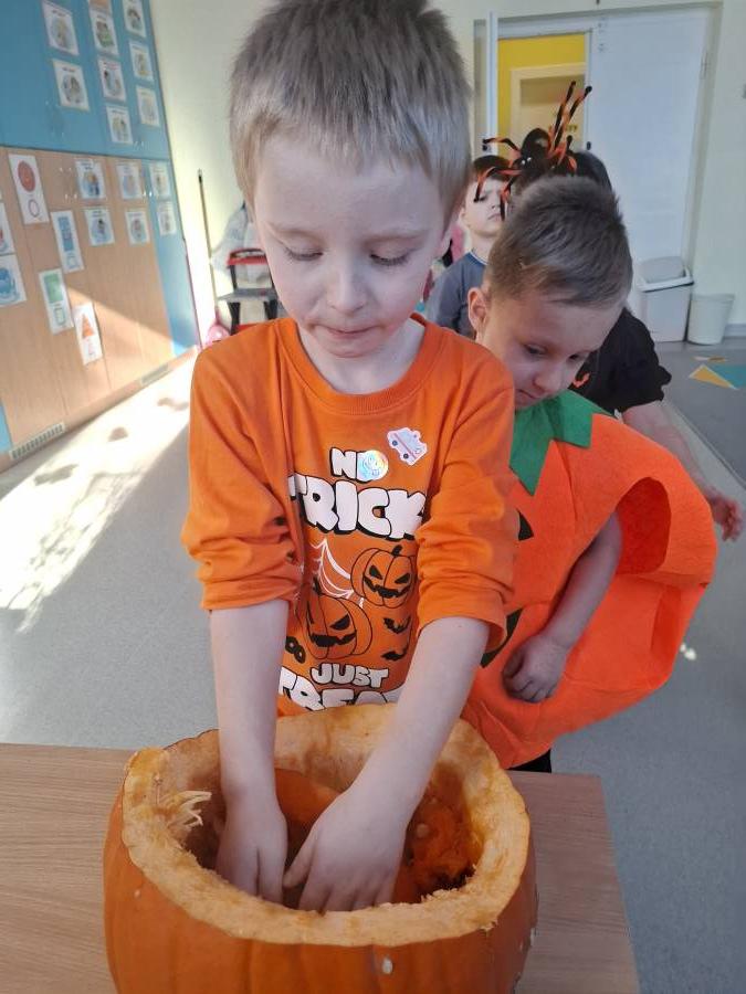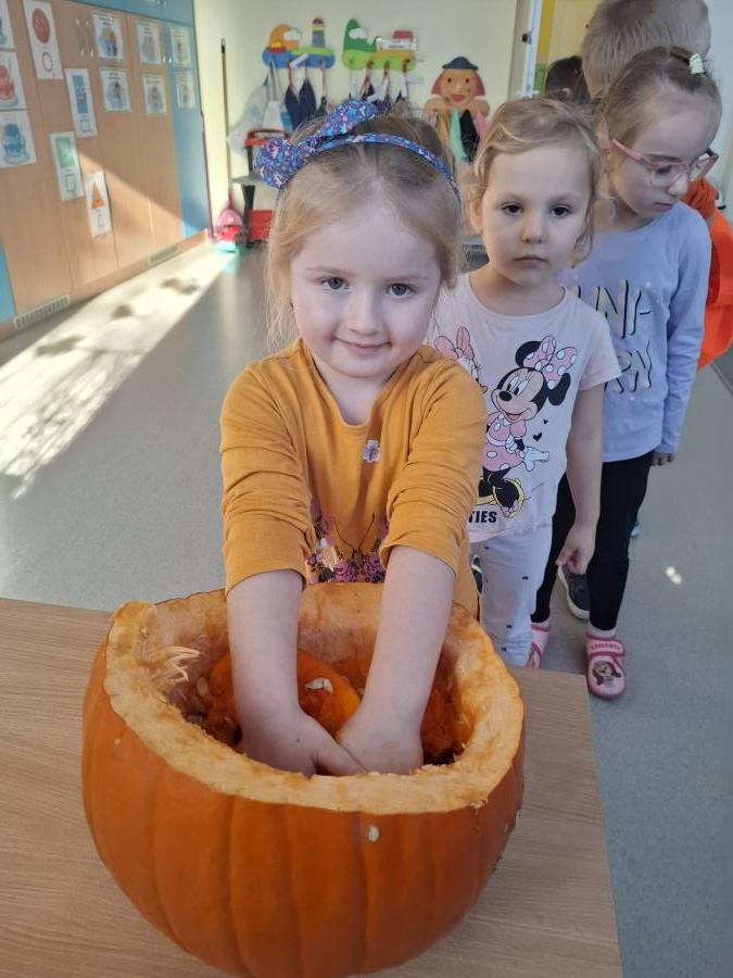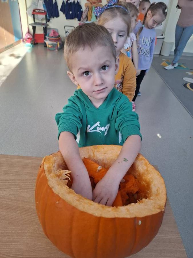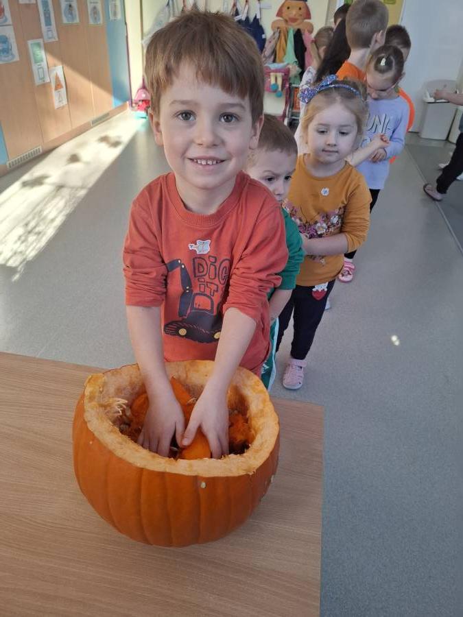 W naszej grupie obchodziliśmy Dzień Dyni. Dzieci miały okazję poznać dynię od środka ? dotykały jej miąższ oraz pestki, obserwując, jak wygląda w środku i jaka ma konsystencję. Następnie wspólnie malowaliśmy dynię, tworząc kolorowe, jesienne dekoracje. Nie zabrakło również zabaw z dynią, które sprawiły dzieciom dużo radości i pozwoliły aktywnie spędzić czas.