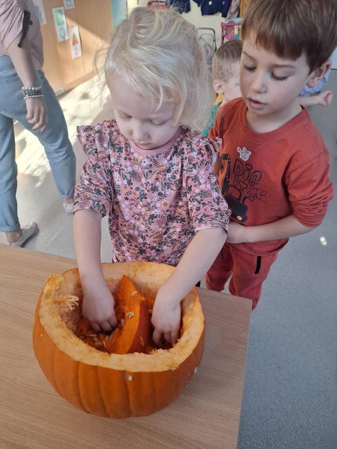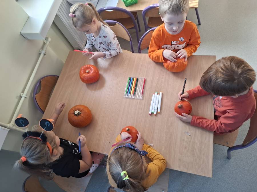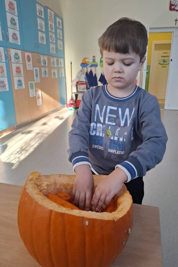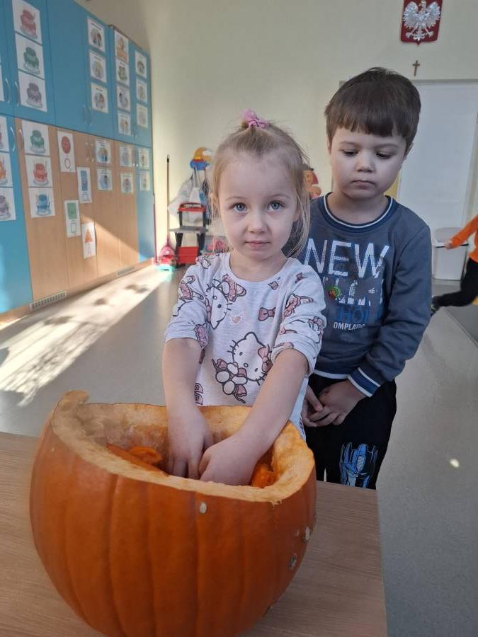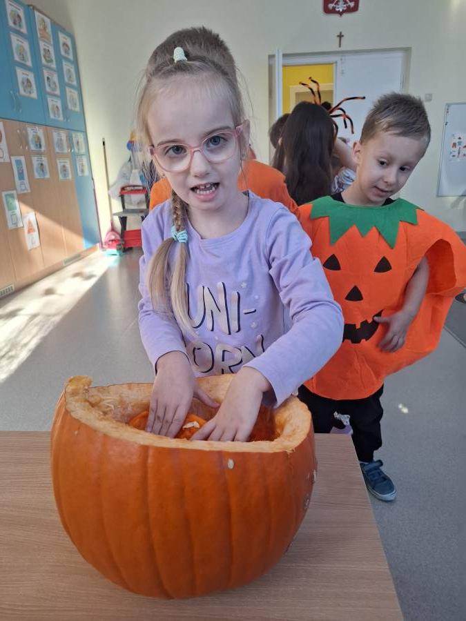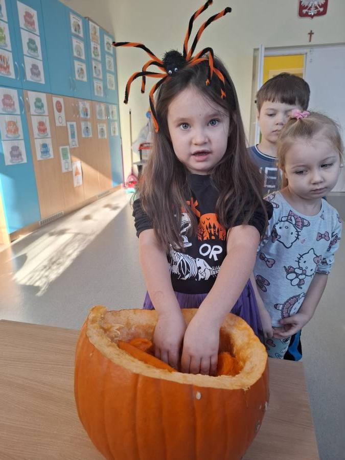 W naszej grupie obchodziliśmy Dzień Dyni. Dzieci miały okazję poznać dynię od środka ? dotykały jej miąższ oraz pestki, obserwując, jak wygląda w środku i jaka ma konsystencję. Następnie wspólnie malowaliśmy dynię, tworząc kolorowe, jesienne dekoracje. Nie zabrakło również zabaw z dynią, które sprawiły dzieciom dużo radości i pozwoliły aktywnie spędzić czas.