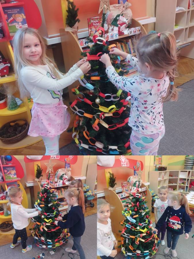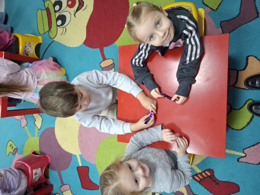 Podczas świątecznych zajęć bibliotecznych przedszkolaki zapoznawały się z tradycjami i zwyczajami Bożego Narodzenia. Dzieci z zainteresowaniem słuchały opowieści o świętach, oglądały książki o tematyce bożonarodzeniowej oraz własnoręcznie wykonywały świąteczną bombkę, rozwijając swoją kreatywność i sprawność manualną.